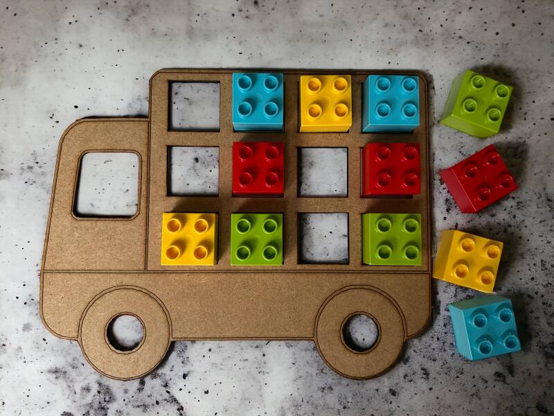 Aan de hand van voorbeeldkaarten laden kleuters de vrachtwagen.